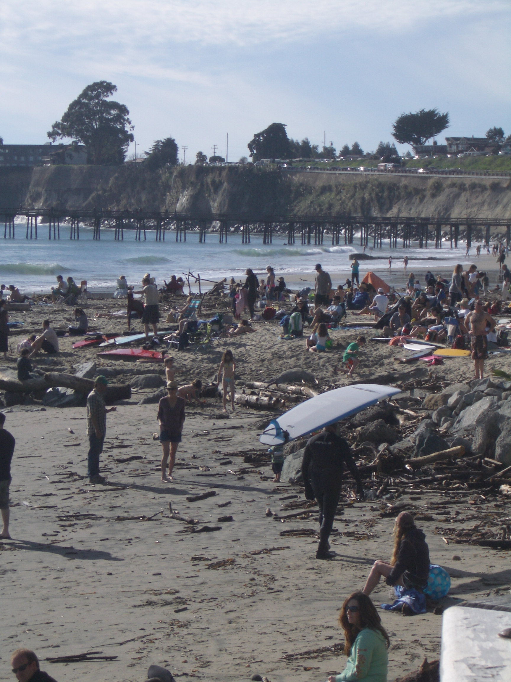 With humble apologies to everyone struggling through snow-filled winters, it was a crazy warm weekend in the Bay Area. And down by the sea in Santa Cruz, it was like a Malibu summer day. Everyone was at the beach, whole carloads of families in wetsuits racing into the surf on boards or just bodies. Campers who’d reserved their beach sites months ago were thinking they’d won the lottery. And when the sun went down yesterday, everyone was out admiring the sunset from rooftops, beach side benches & hillside cliffs. People were packing wine & picnics to celebrate. It was 67 degrees and felt hotter on the sand with the sun beaming down.