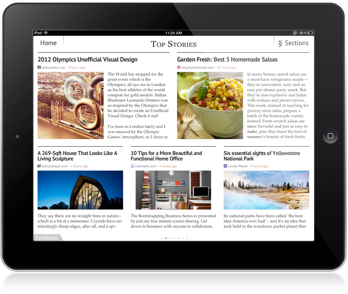Flipboard also offers an addictive selection of other content providers to suit your every interest and private passion. It allows you to choose content providers you like and turn them into your own private Zine. I’m partial to Food 52, Ted Talks, Design Sponge, Bay Area Bites, CNN Breaking News  and Fortune Magazine. There are literally dozens of pop content providers to choose from in all categories.