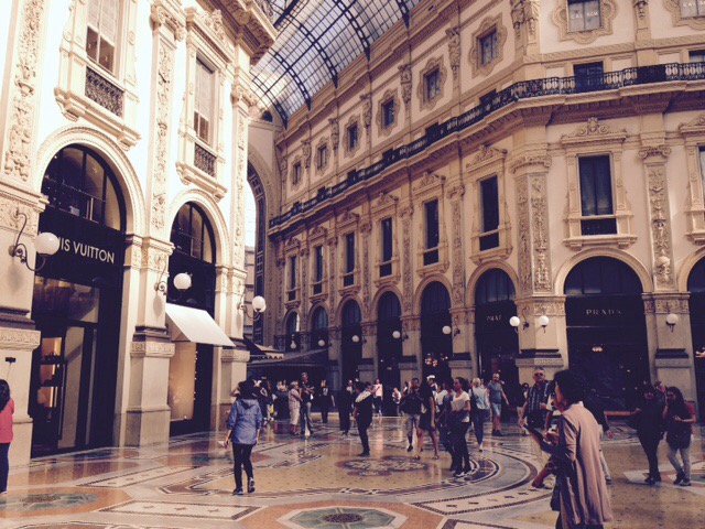 After settling in our b&b, Room Inn, tucked behind gates in a hip area of downtown jammed with bars and cafes, we walk to the Duomo to see the number one Milan attraction, the white church with its dozens of gorgeous Gothic spires. But first we passed through another kind of church– the unbelievably glitzy church of wholly consumption– a gallery of high end shops under arcaded roofs and packed with global shoppers. I stood at the corner of Louis Vuitton and Prada dumbstruck that there could be such a paean to shopping right next to the holy see. It was surreal.