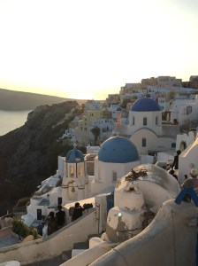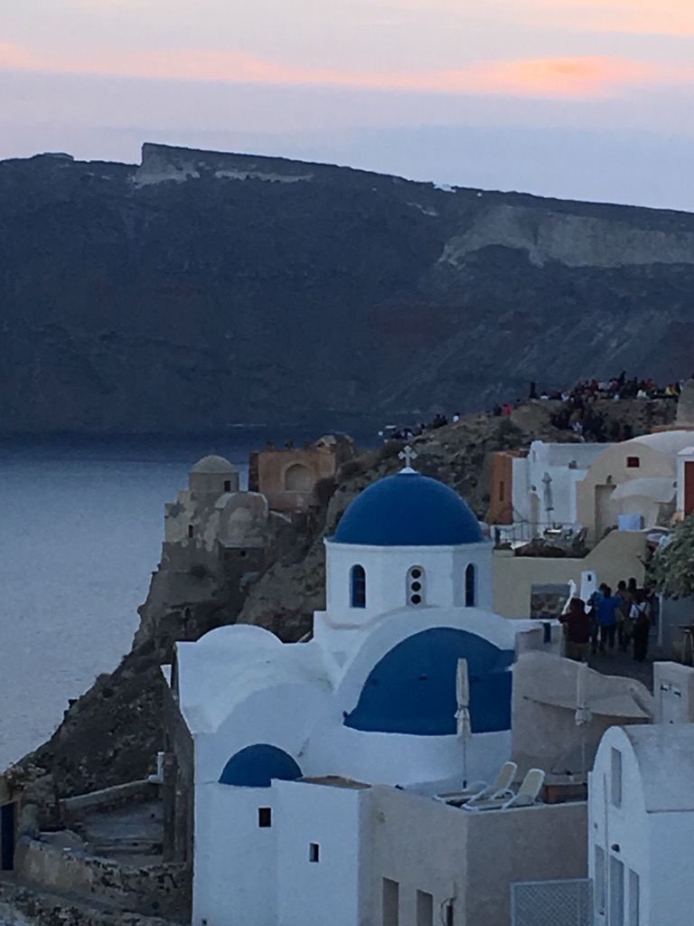Oia is the northernmost town with the legendary scene (in countless postcards and paintings) of three blue domed churches facing the sea. It is also legendary for its views of the caldera (volcanic sea cauldron) at sunset. Our mission: to find the iconic blue churches before sunset.