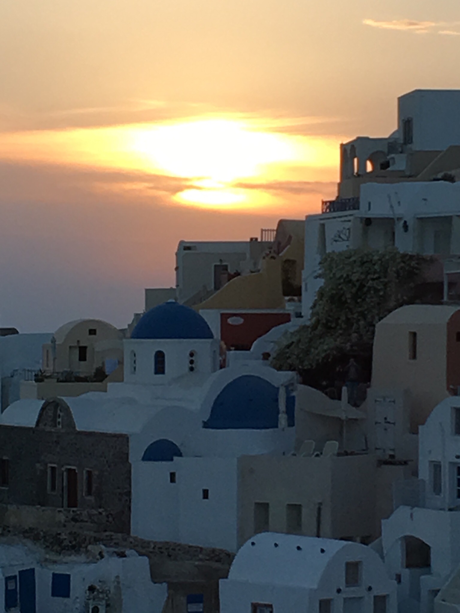 And then we saw a group of Japanese tourists and a wedding couple excitedly pouring down yet another staircase. We decided to follow them. As we wound down the steps, we saw it. Our shining blue domed churches, our setting sun, our ecstatic lighting. We pushed into the throng and started shooting (photos) and didn’t stop till the sun did!