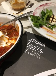 Dinner that night was at Aroma Avlis in Exo Gonia– winery by day, restaurant by night. Salad with grilled haloumi cheese on top, white eggplant in red sauce, shrimp & pasta for me and lamb stew for him. Chocolate mousse for both. And spectacular white wine.