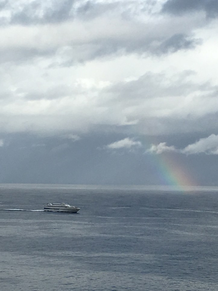 Today, Friday, it is raining. A. is definitely sick, I am fighting it. However, we are resting quite comfortably in our genteel hotel facing the sea with clear views of passing ferries, shocking rainbows and intermittent downpours. Its quite pretty and quiet here after bustling Naples.