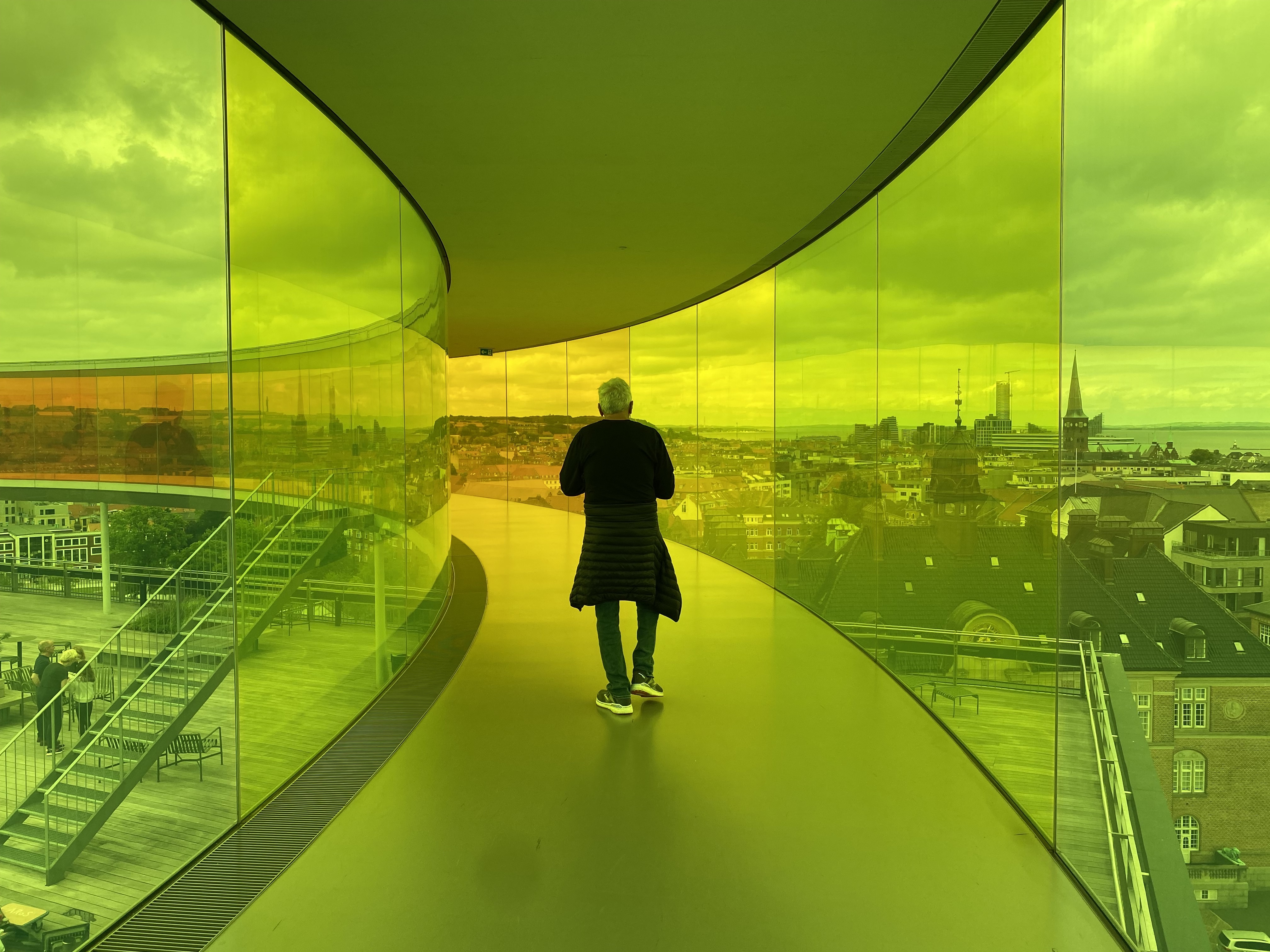 So how did we manage to walk almost 8 miles (18,500 steps) on our first day? Walking around in circles at Olafur Eliasson’s extraordinary “Your Rainbow Panorama” circular roof atop the Aros Contemporary Art Museum! This is a spectacular topping to this luscious cake of a museum.