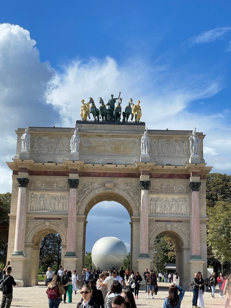 Old & new ‘triumphantly’ co-exist: Olympic sphere & Arc de Triumph at the Tuileries.