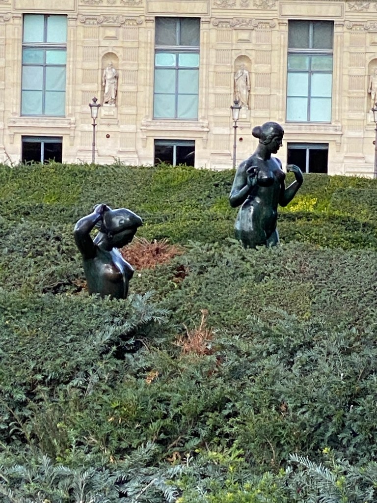 Instead, around 3 pm, we took the train to the Louvre. It was pouring rain when we left so a museum seemed the perfect activity. After a 15 minute ride, we exited the subway to bright sunshine. We got on the non-ticketed Louvre line that was moving smartly until we got to the head. Then no movement for over 20 minutes.  I said “ let’s ditch this joint.” Instead, we decided to walk through the Tuileries gardens to L’Orangerie Museum at the other end of the park  that our friends M&S raved about.