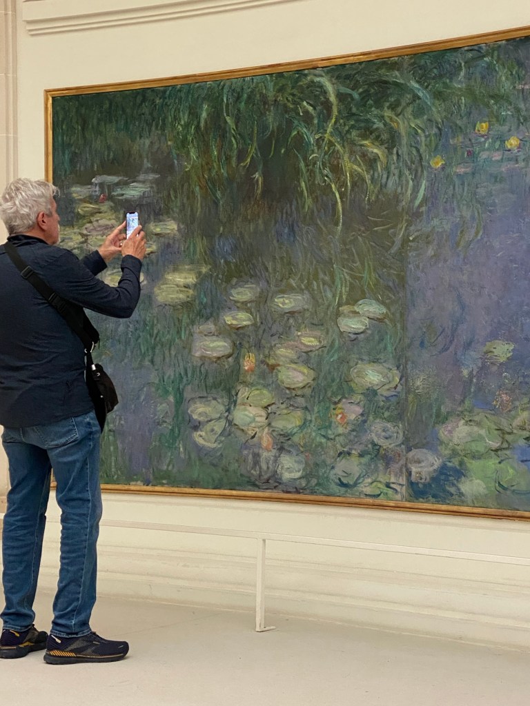 But the big draw of the museum was the Monet murals of his beloved water lilies.  These room size, impressionist works envelop you in their tranquility and romance.  Viewers are requested to treat these two salons ( 8 murals!) as meditation spaces but there were plenty of people taking selfies, shooting “influencer videos” and simply absorbing the art as well.