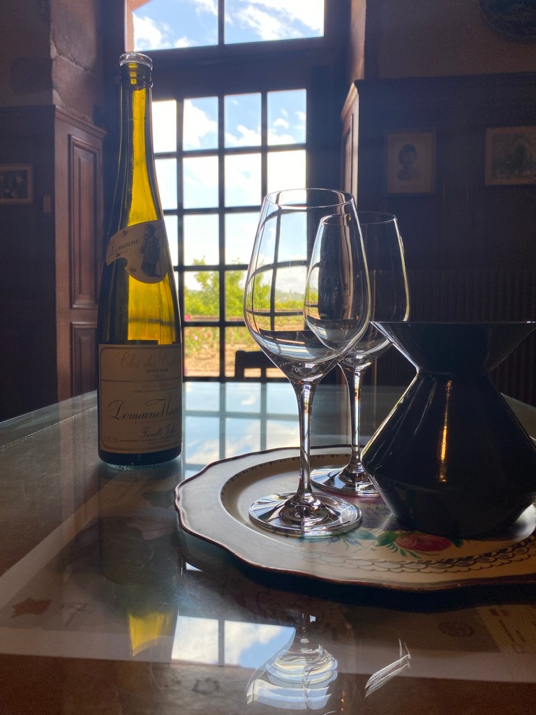 But first… confusion! Turns out our rental was from the Strasbourg Airport, not the Central Station. We put on our most piteous expressions and the kind Budget agent changed the rezzie and even upgraded us from a stick mini to an automatic hybrid. And tout alors, we were on the road to Weinbach vineyard an hour out of town. There we enjoyed a lengthy tasting ( I lost count after 5 tastes) of mostly Riesling, Chablis and gewurztraminer in a private room filled with antiques. And withthe charming Sarah as our informative wine guide.