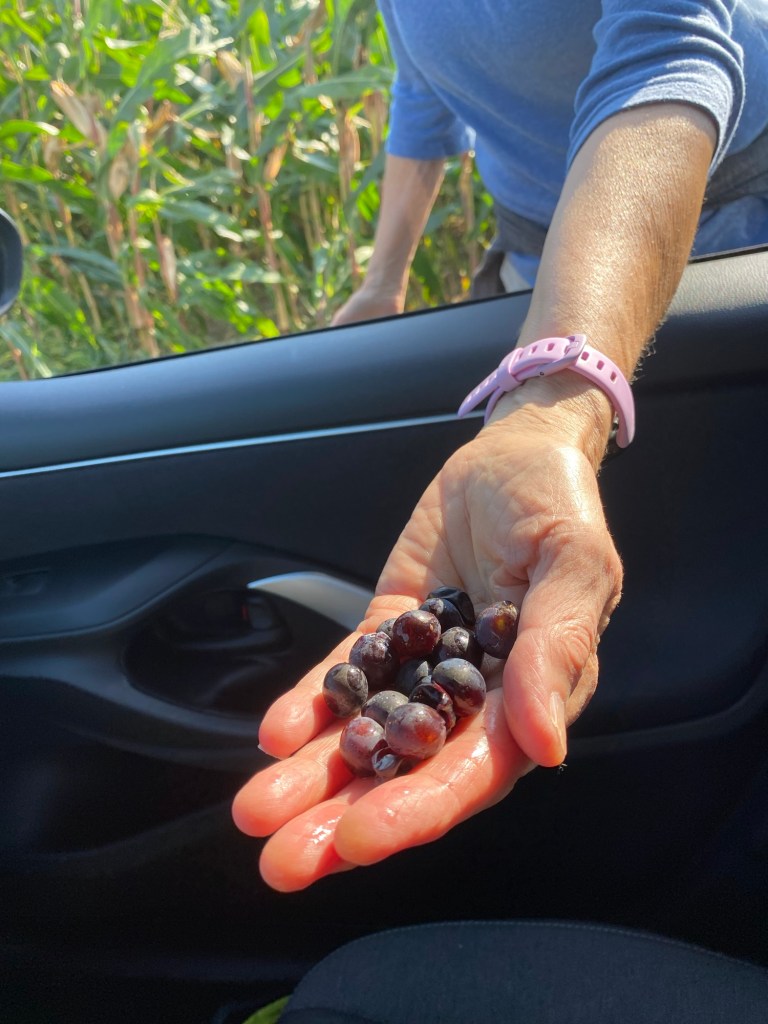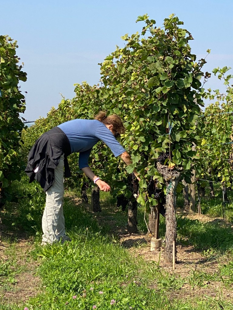 But wait. I haven’t told you about our second wine tasting. This one was 20 minutes out of town at Pfister, a family owned winery since 1780. Melanie, the 8th generation of the family, was our sommelier. But before she took us into their tasting room, she had to help dump barrels of freshly picked grapes into the sorter! This is harvest season and it’s all hands on deck! She was an ace on the forklift.