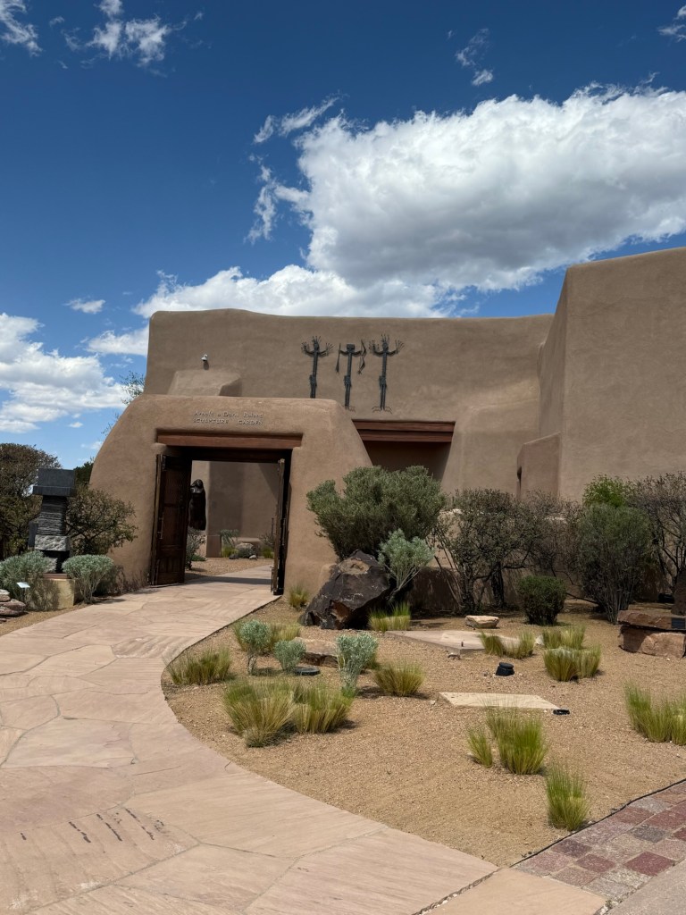 During our first three days ,we hit three museums and walked the endless gallery row of Canyon Road.  We’ve admired the classic Pueblo style that triggered the Southwest architecture and design aesthetic that stills rocks our senses.  Pueblo style adobe homes  are everywhere garbed in rust and tawny shades. These colors are are an arresting contrast with brilliant blue skies, white clouds and green desert flora. The color palette never tires.