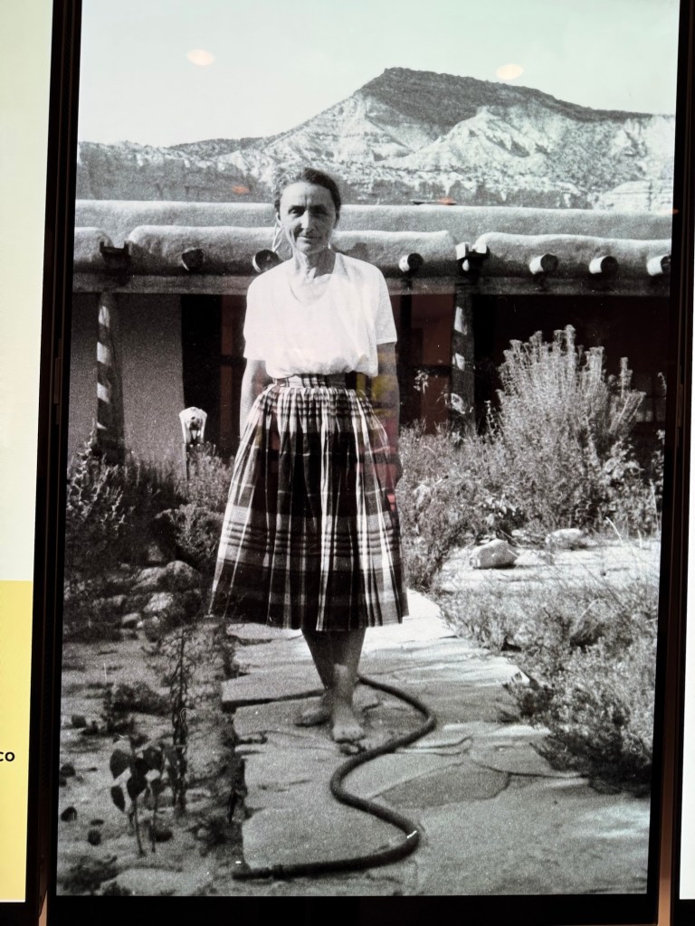 The museum also exhibited many artifacts of O’Keefe’s life in New Mexico as well as numerous portraits. In many of the images, she reminded me of Frida Kalho. Both artists dressed to express their identities, Kahlo in vivid patterns and O’Keefe in austere black and white. Both have become even more famous posthumously. Both also exhibited an androgynous air and intense sexual power. Or maybe I’m just projecting!