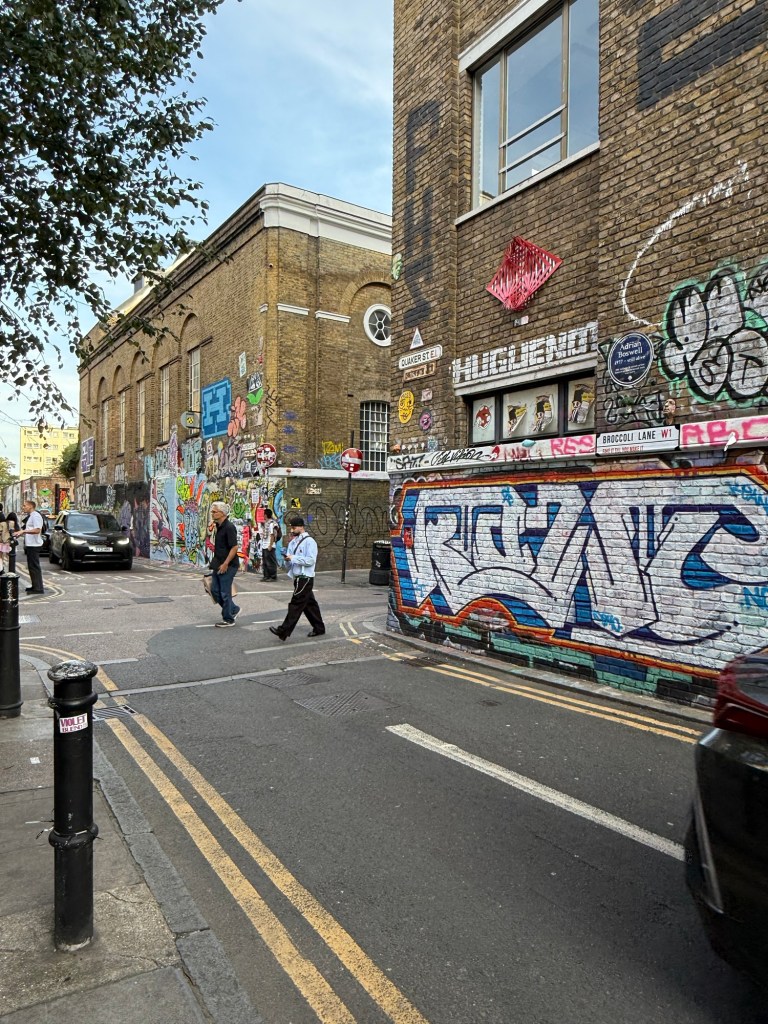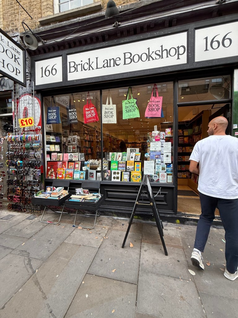 That night, we bussed to trendy, cool Shoreditch nabe (I,e. Graffiti-spattered, dirty  streets with no one under 30 …and us!). There we found the famous Brick Lane of Jack the Ripper and, more recently, the eponymous novel of Monica Ali.