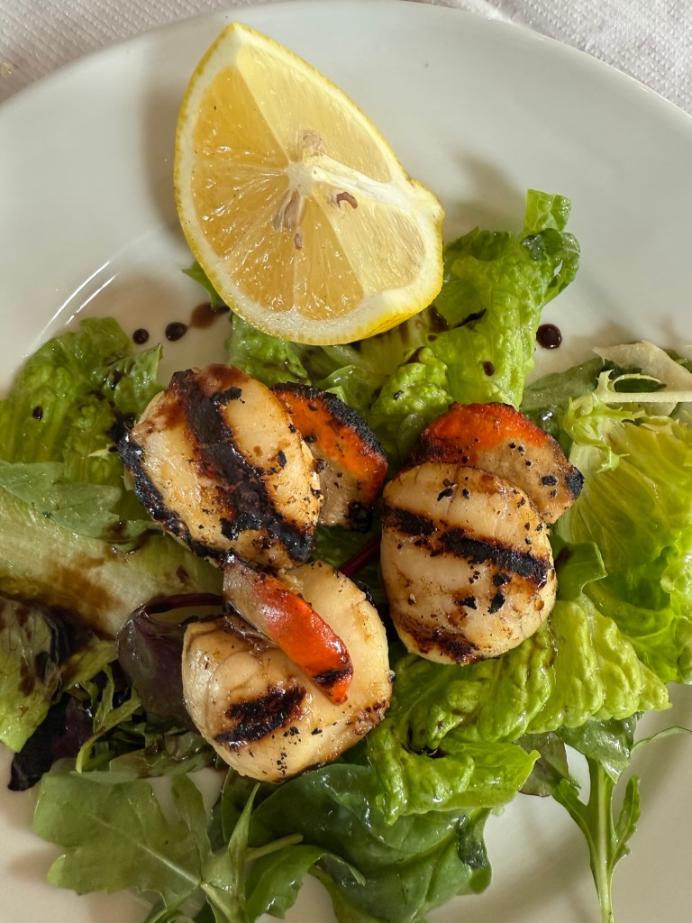 OMG.  We exited the train, walked a bit and arrived at the recommended atmospheric and welcoming Whitstable Oyster Company right across from the beach. The food was a revelation.  While only Andy tried the raw oysters, I joined him for the grilled chimichurri ones.  We also shared grilled scallops and a whole Dover sole. And crusty bread and butter and delicious rose lemonade.  It was a seafood feast by the sea.
