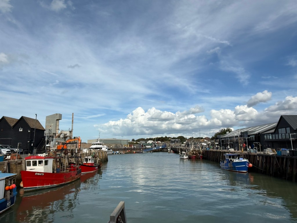 Monday was bright again.  We decided to travel by train nearly 2 hours to the beach town of Whitstable on the recommendation of the young family at Sunday dinner.  They said it was famous for oysters fresh from their seaside and its active harbor.